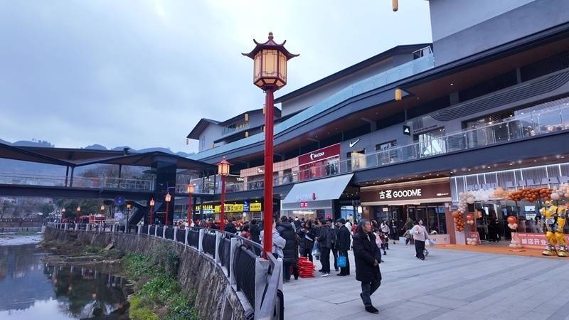 腊月里,笔者走入毕节市金沙县长安里,只见一派熙攘红火的景象。灯笼缀满廊檐,喜庆的乐声在开阔的街巷间轻盈流淌。不同于传统商场“封闭的盒子”,这里街巷连通、步道婉转,与不远处金沙河的波光树影自然相融。最巧妙的,莫过于那“双首层”的设计。